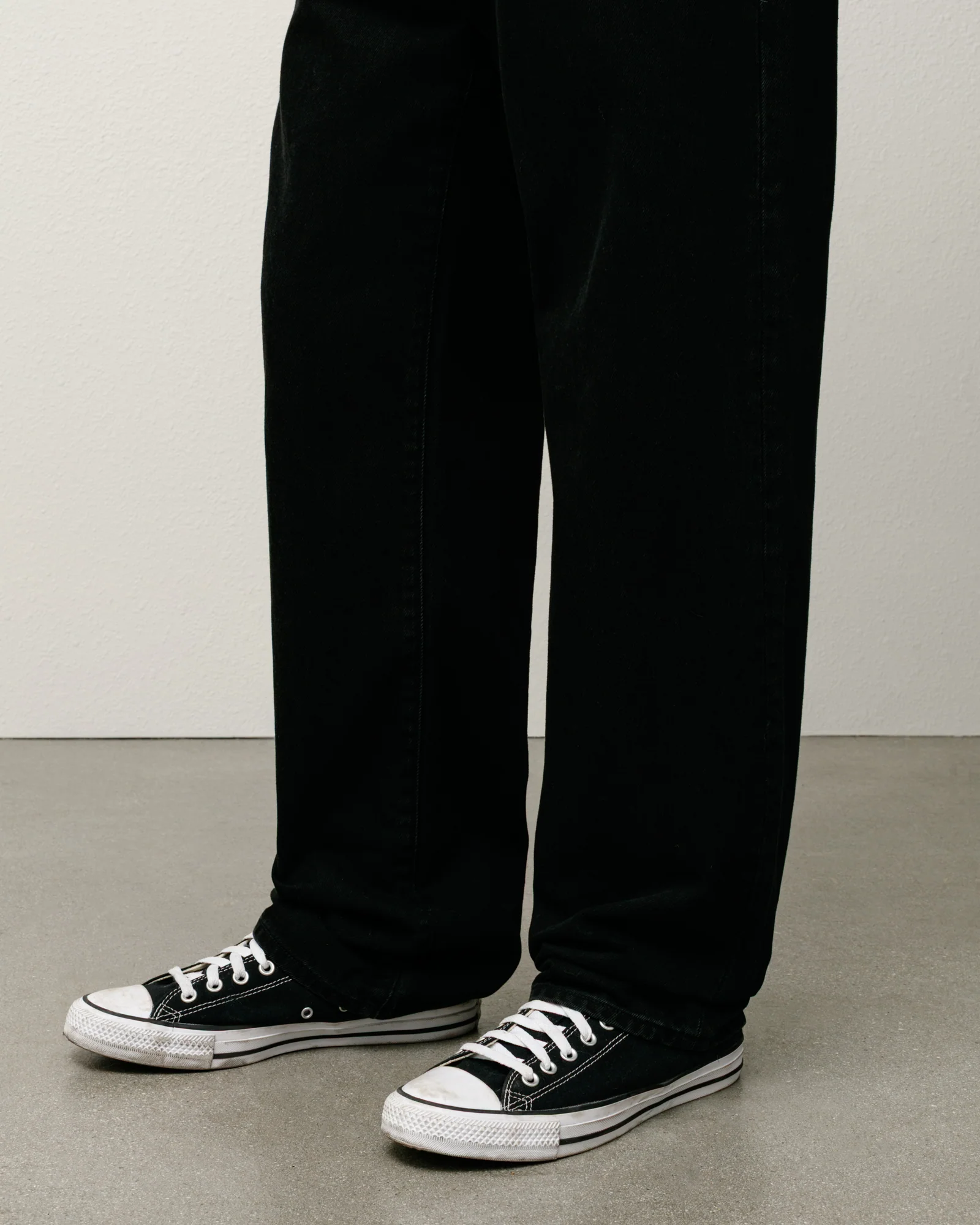- Regular waist with a mid rise, straight cut, and slim leg opening
